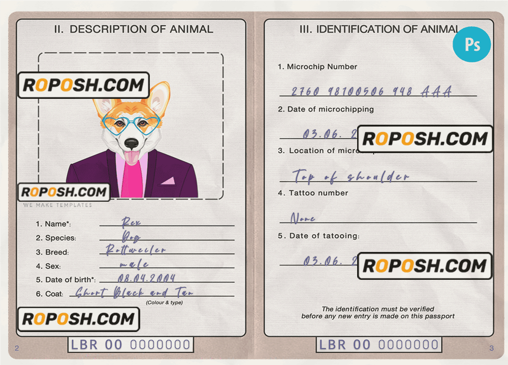 Liberia dog (animal, pet) passport PSD template, is designed to look and feel like real documents. Each template is carefully crafted to include all the necessary details, such as your pet’s name, breed, date of birth, and microchip information. With our fillable cat or dog passport templates, you can quickly and easily create a editable pet passport that meets all the requirements for international travel.