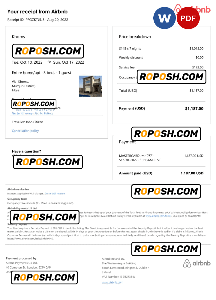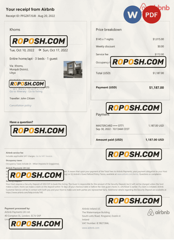 This Blank Libya Airbnb booking confirmation PDF Template is perfect for a variety of uses, such as Visa applications, proof of accommodation, showing your expenses, and more. You can even use it to create realistic copies of your credit card for novelty documents. We have a variety of other templates available, including passport templates, ID card templates, reciept template, and more.