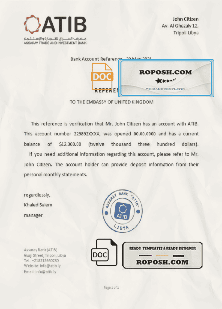 Libya Assaray Bank bank reference letter template in Word and PDF format