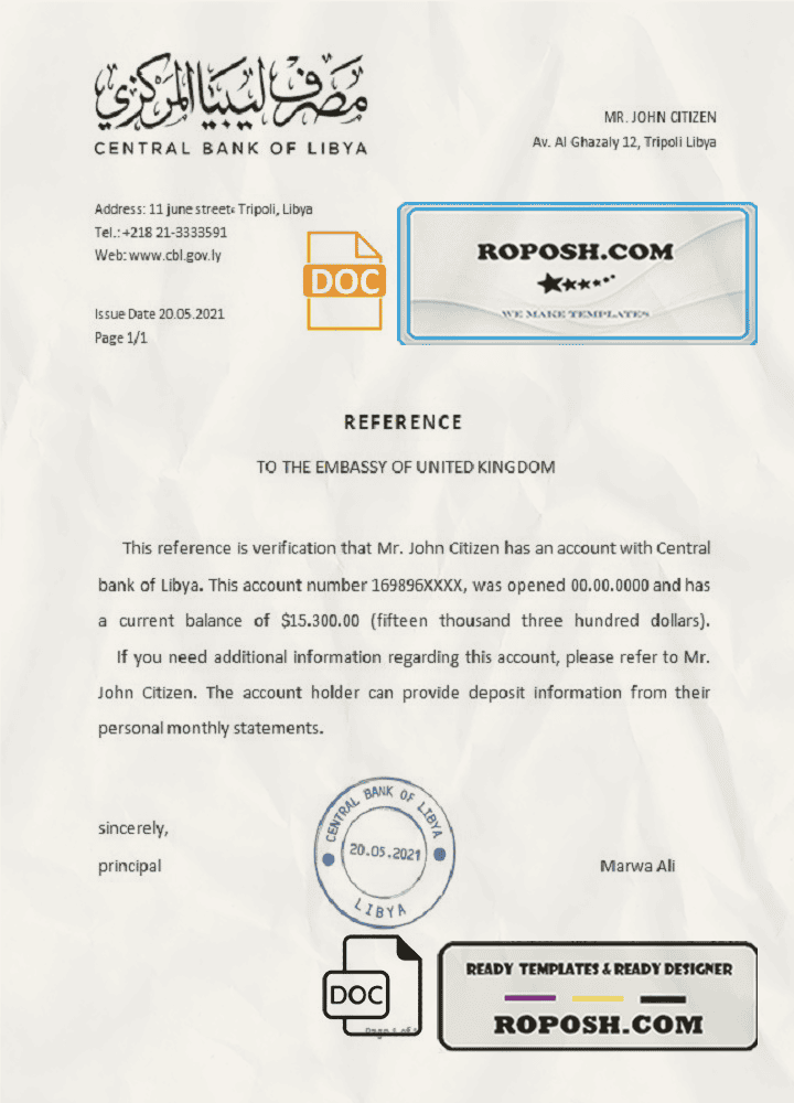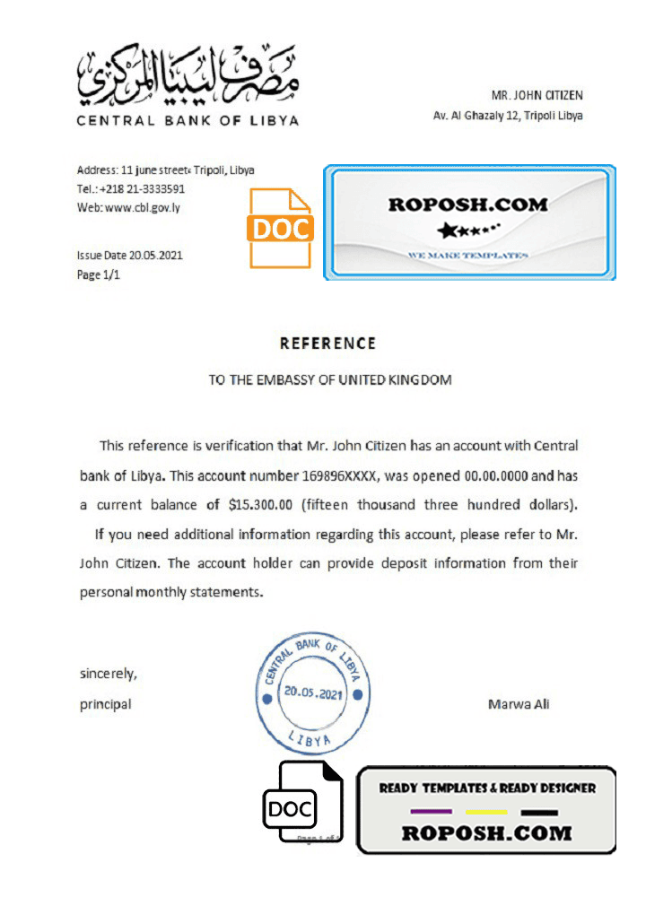 Libya Central Bank of Libya bank reference letter template in Word and PDF format