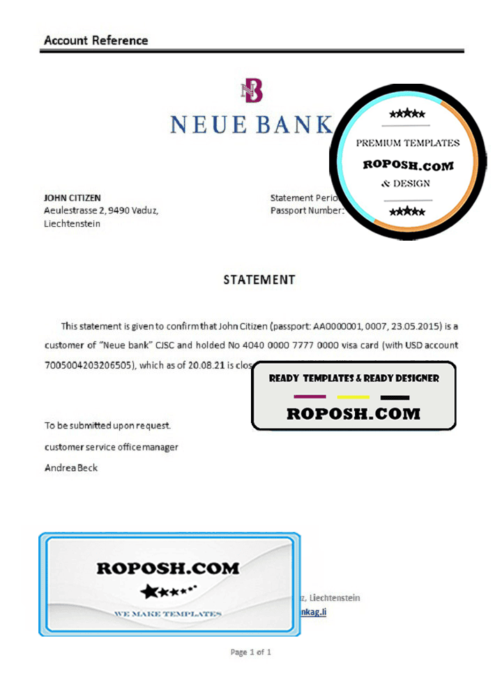 Liechtenstein Neue Bank bank account closure reference letter template in Word and PDF format offer high-quality customizable bank reference form template in PSD and Word format, allowing you to easily fill in your personal details and make them look authentic. Our templates are perfect for online account verification, research, presentation, or work.