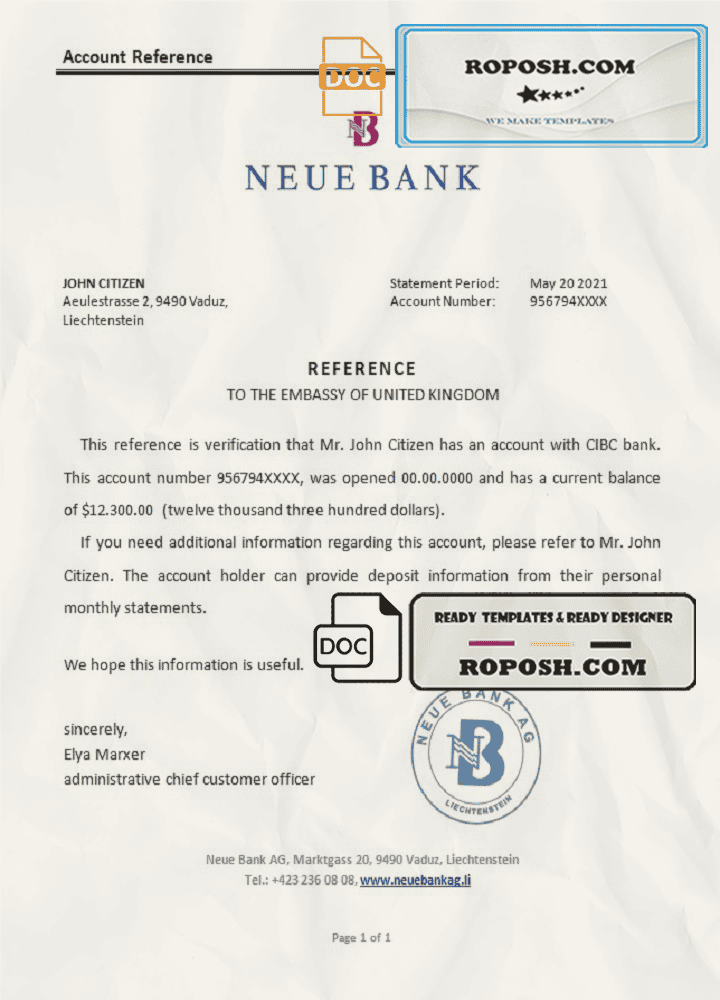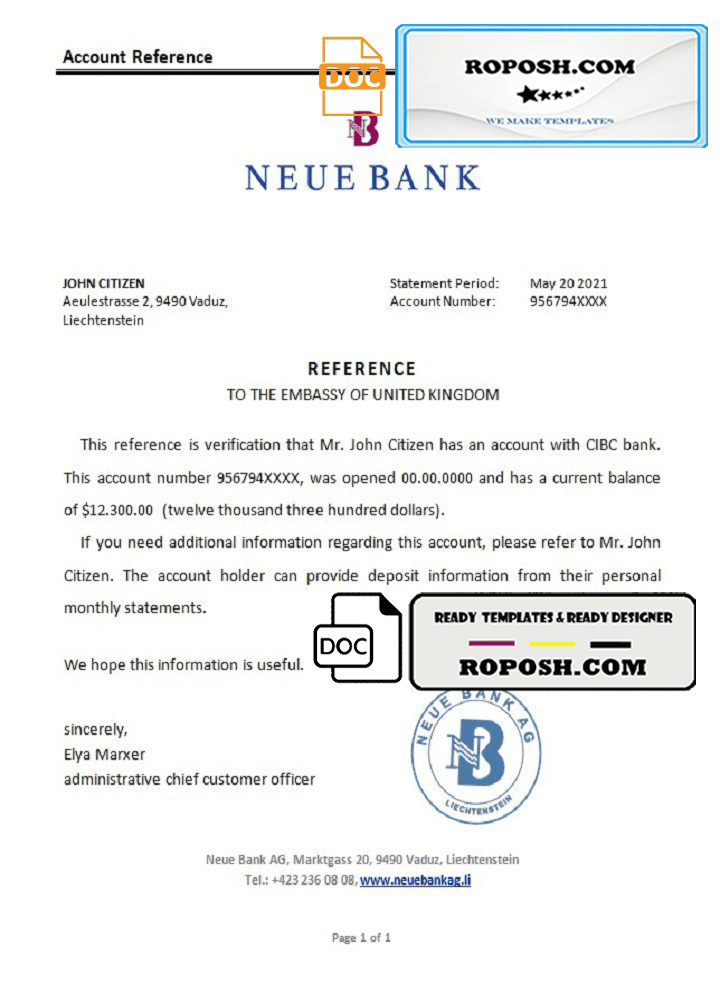 Liechtenstein Neue Bank bank reference letter template in Word and PDF format