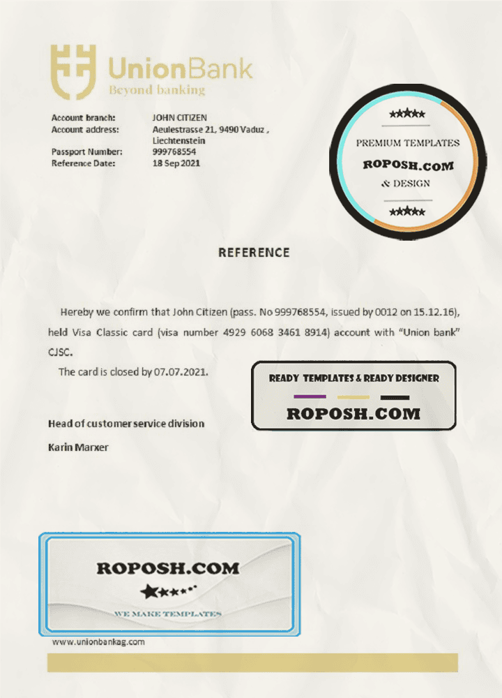 Liechtenstein Union Bank bank account closure reference letter template in Word and PDF format