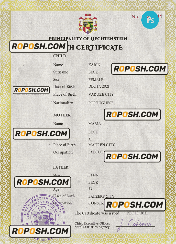 roposh offers hundreds of high-quality, realistic, and customizable birth certificates. The Liechtenstein birth certificate template is fully fillable, and you can complete it with any information you wish, such as name, surname, birth date, place of birth and etc. Whether you are using our PSD template (a layer-based adobe photoshop file) or our PDF template (a Microsoft Office editable file) you will get a package with fonts included instantly. No need to worry even if you can’t generate realistic birth proof yourself, we offer reliable editing service with your desired information for an extra charge. Also, we are always online and here to help you experience a confident purchase. So, reach out!