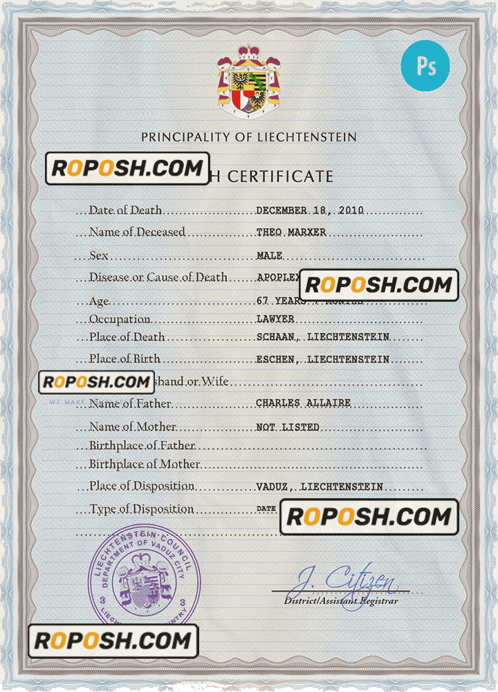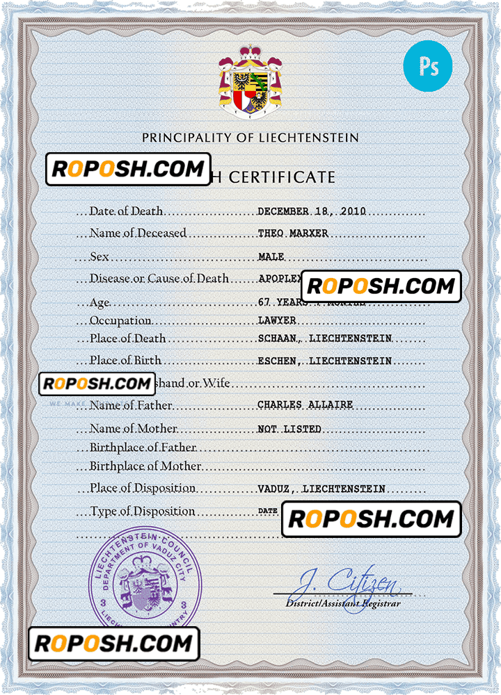 Explore a vast collection of legitimate-looking editable death certificates for several countries worldwide. The editable Liechtenstein death certificates offers easy access to obtaining the required document for a variety of purposes, predominantly claiming life insurance, pensions, and resolving estates.