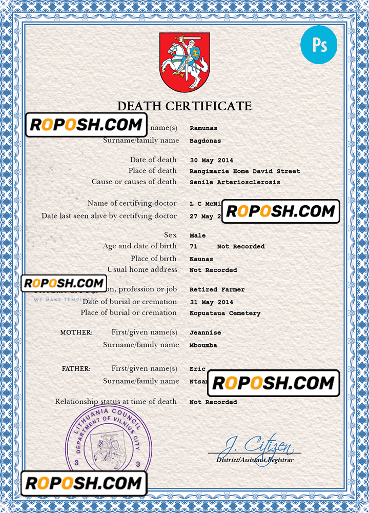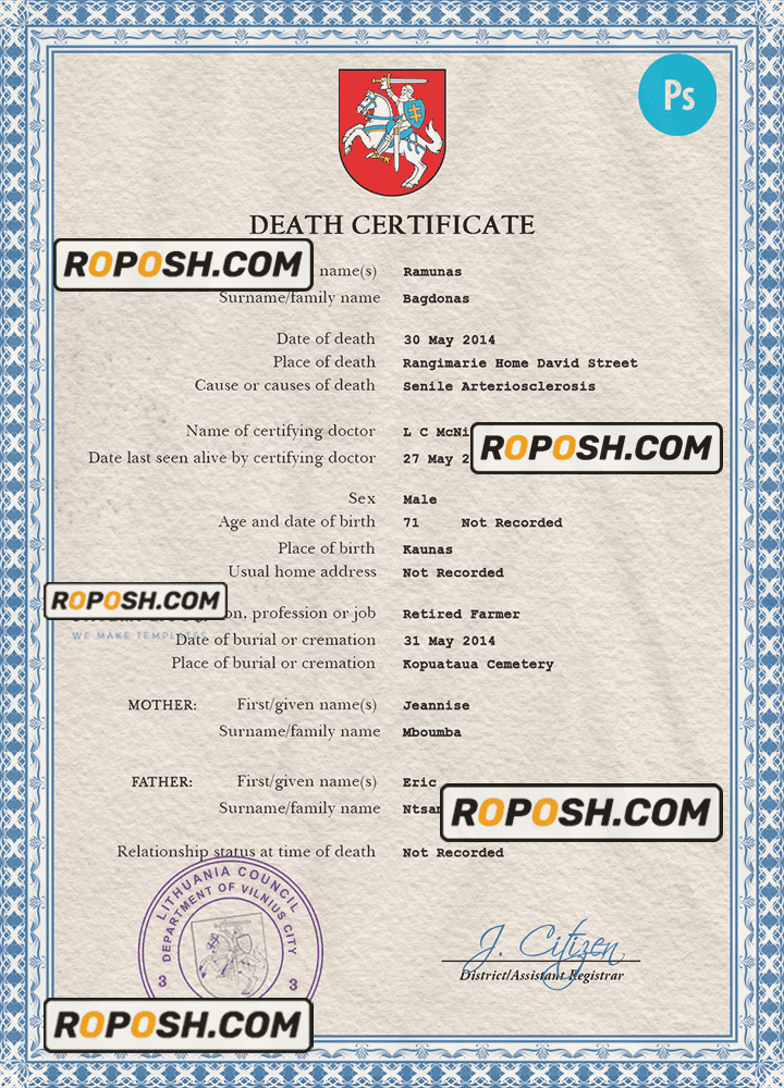 Lithuania death certificate PSD template, completely editable