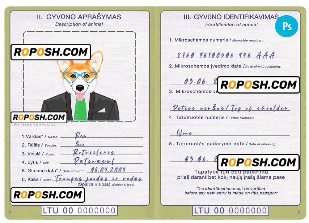 Lithuania dog (animal, pet) passport PSD template, is your one-stop-shop for realistic and editable editable pet identity cards and passports. We specialize in creating high-quality, customizable editable pet passports and identity cards for dogs, cats, and other furry friends.