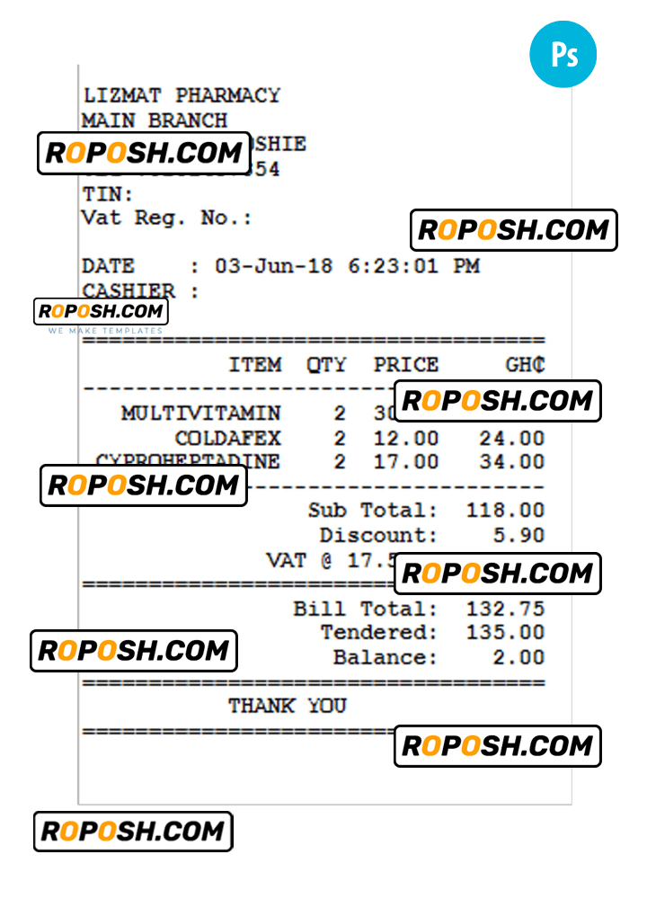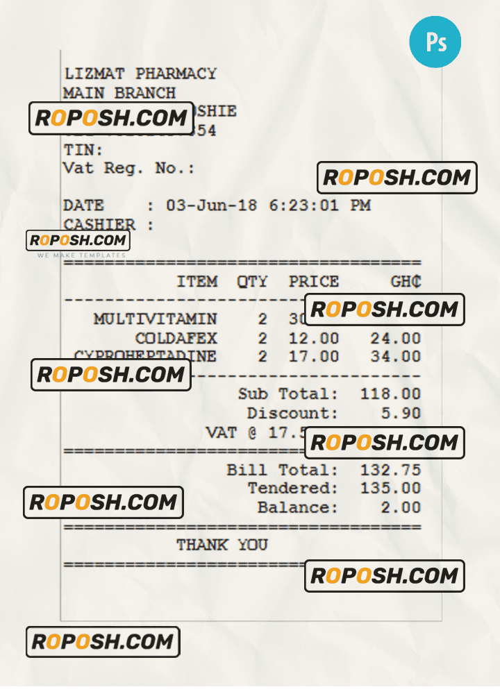 Blank LIZMAT PHARMACY Receipt PSD Template :