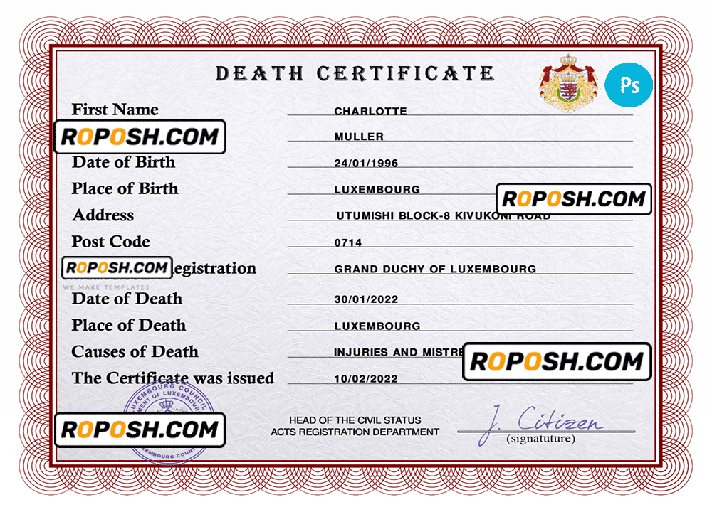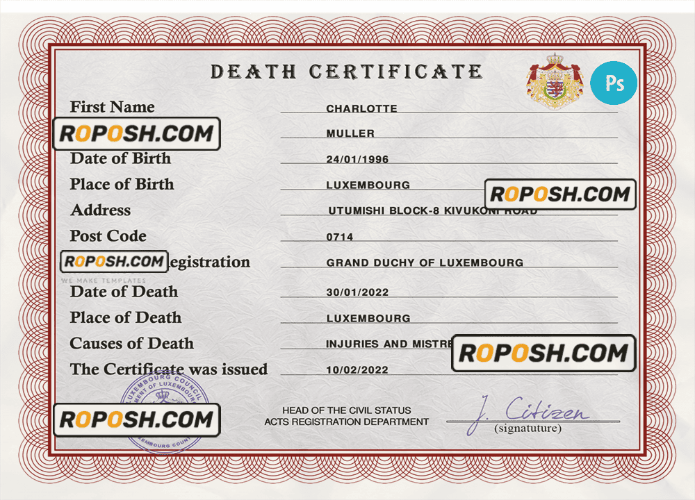 Be the first to review “Luxembourg vital record death certificate PSD template”