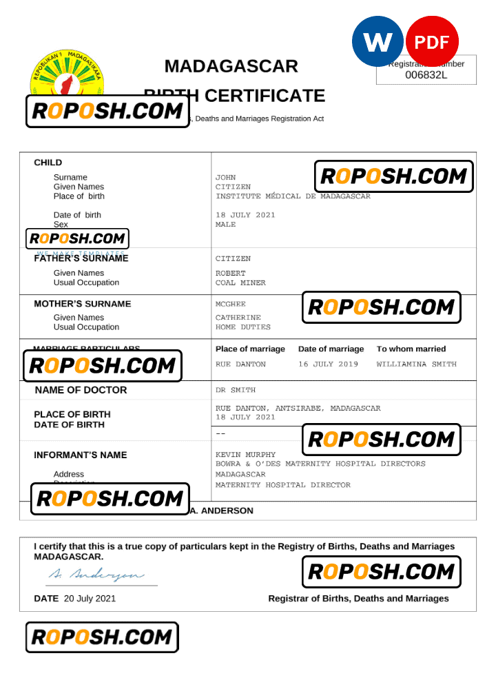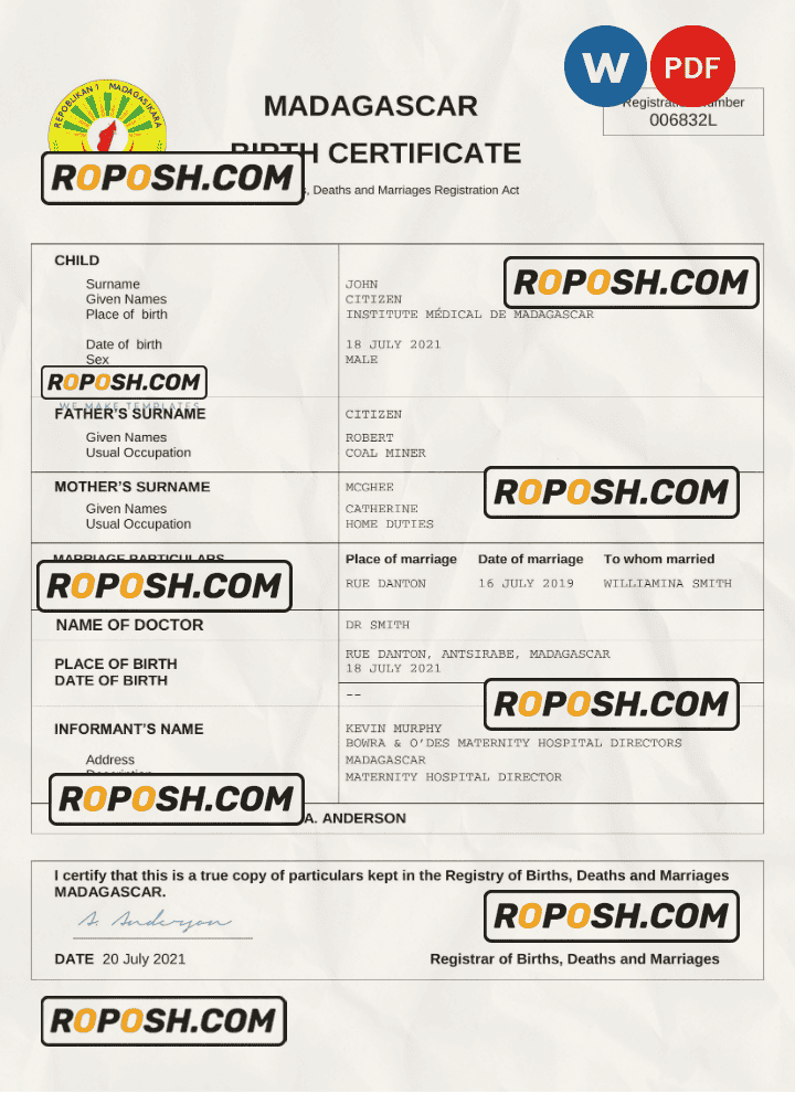 roposh offers hundreds of high-quality, realistic, and customizable birth certificates. The Madagascar birth certificate template is fully fillable, and you can complete it with any information you wish, such as name, surname, birth date, place of birth and etc. Whether you are using our PSD template (a layer-based adobe photoshop file) or our PDF template (a Microsoft Office editable file) you will get a package with fonts included instantly. No need to worry even if you can’t generate realistic birth proof yourself, we offer reliable editing service with your desired information for an extra charge. Also, we are always online and here to help you experience a confident purchase. So, reach out!
