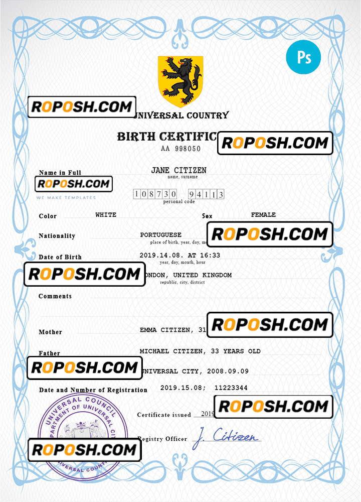 roposh offers hundreds of high-quality, realistic, and customizable birth certificates. The major universal birth certificate template is fully fillable, and you can complete it with any information you wish, such as name, surname, birth date, place of birth and etc. Whether you are using our PSD template (a layer-based adobe photoshop file) or our PDF template (a Microsoft Office editable file) you will get a package with fonts included instantly. No need to worry even if you can’t generate realistic birth proof yourself, we offer reliable editing service with your desired information for an extra charge. Also, we are always online and here to help you experience a confident purchase. So, reach out!