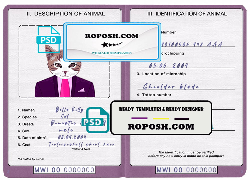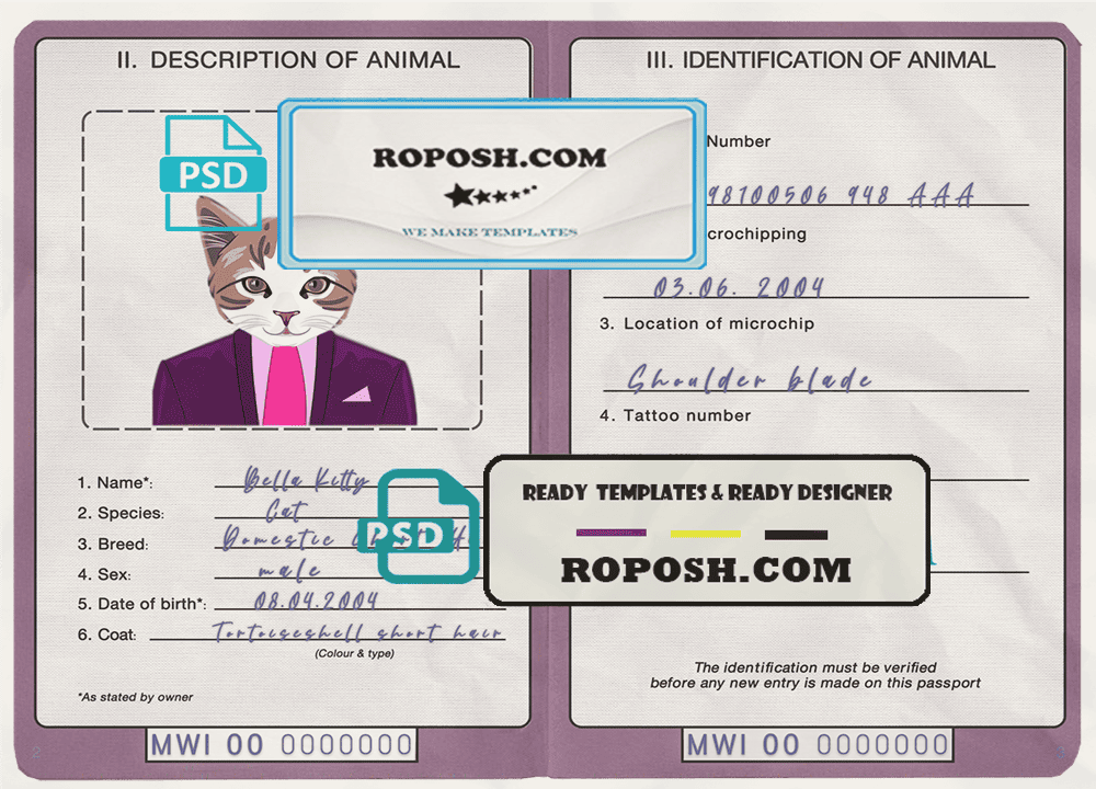Malawi cat (animal, pet) passport PSD template, is your one-stop-shop for realistic and editable editable pet identity cards and passports. We specialize in creating high-quality, customizable editable pet passports and identity cards for dogs, cats, and other furry friends.