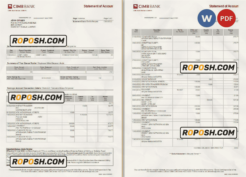 Malaysia CIMB bank statement Word and PDF template, 2 pages