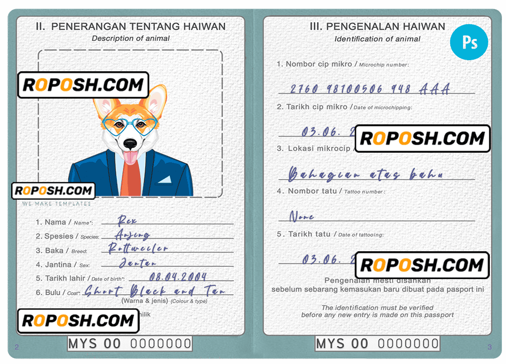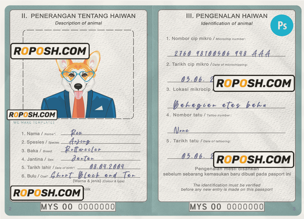 Malaysia dog (animal, pet) passport PSD template, is designed to look and feel like real documents. Each template is carefully crafted to include all the necessary details, such as your pet’s name, breed, date of birth, and microchip information. With our fillable cat or dog passport templates, you can quickly and easily create a editable pet passport that meets all the requirements for international travel.