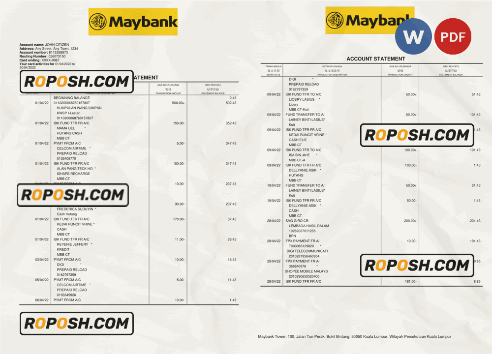 Download our fully editable Malaysia Maybank Bank Statement Word Template from Roposh and customize it with your information to create realistic novelty documents. This template is beneficial if your bank statement is expired, stolen, or unavailable. We also offer editable credit card templates, ID card templates, bank statement PSD templates, driver’s license PSD templates, and printable editable blank utility bill templates.