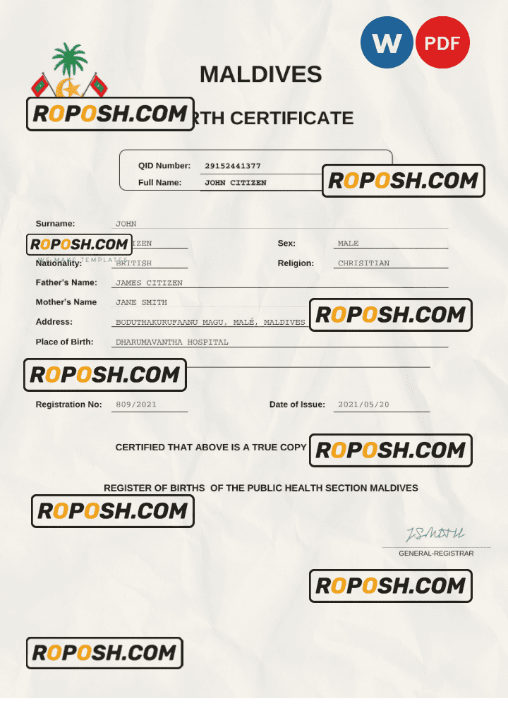 roposh offers hundreds of high-quality, realistic, and customizable birth certificates. The Maldives birth certificate template is fully fillable, and you can complete it with any information you wish, such as name, surname, birth date, place of birth and etc. Whether you are using our PSD template (a layer-based adobe photoshop file) or our PDF template (a Microsoft Office editable file) you will get a package with fonts included instantly. No need to worry even if you can’t generate realistic birth proof yourself, we offer reliable editing service with your desired information for an extra charge. Also, we are always online and here to help you experience a confident purchase. So, reach out!
