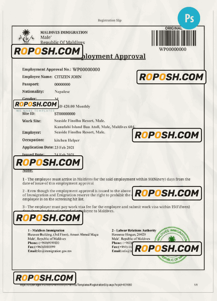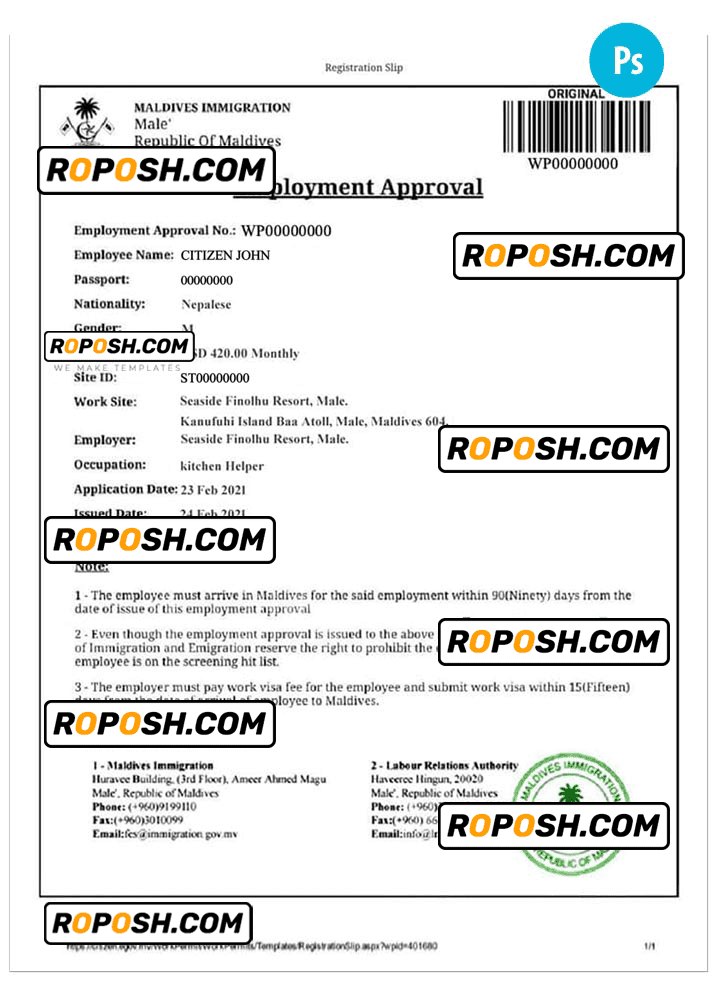 MALDIVES electronic visa template psd. Buy Customizable Travel Visa Template with high quality and enjoy its unique features such as easy to customize, Layer based, fonts included sample. you can edit this template and  put any name, address, license number, Id number, birth date, height, weight, expire date, change photos etc. This Photoshop template is a layer based psd file and it’s easy to Editing.To modify this photoshop template file you will need a Photo editing software such as Adobe Photoshop No need to be expert on editing software like adobe Photoshop. However, You just have to basic knowledge on adobe photoshop, to edit this template. Never used low quality template. Your account may be suspended. Also, if you’re looking for an editable SSN template, Roposh is by your side so you can get it easily and even for free.