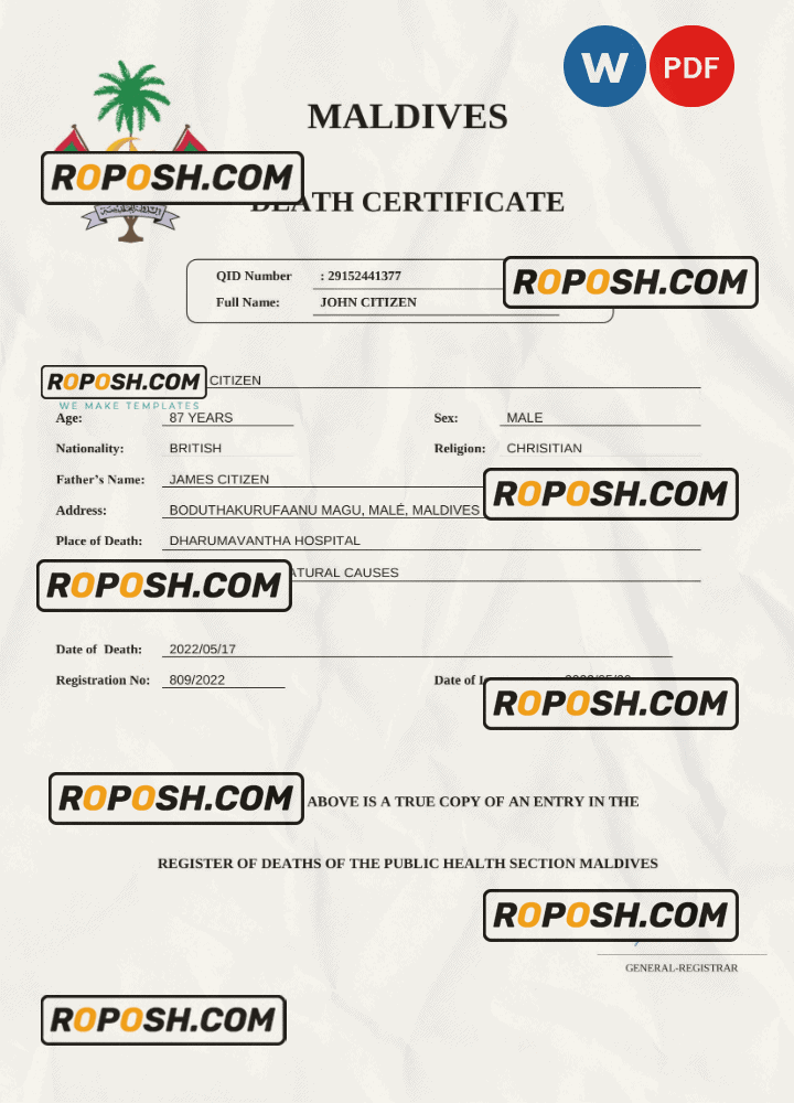 Explore a vast collection of legitimate-looking editable death certificates for several countries worldwide. The editable Maldives death certificates offers easy access to obtaining the required document for a variety of purposes, predominantly claiming life insurance, pensions, and resolving estates.