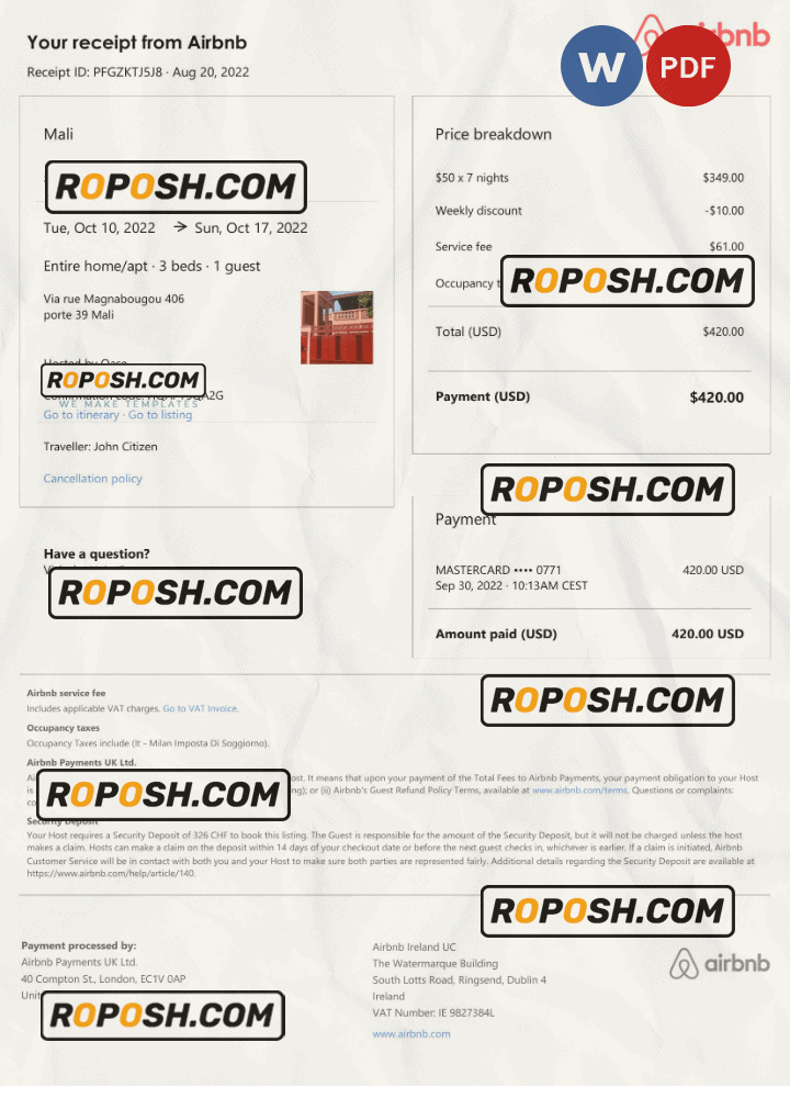 This Blank Mali Airbnb booking confirmation PDF Template is perfect for a variety of uses, such as Visa applications, proof of accommodation, showing your expenses, and more. You can even use it to create realistic copies of your credit card for novelty documents. We have a variety of other templates available, including passport templates, ID card templates, reciept template, and more.