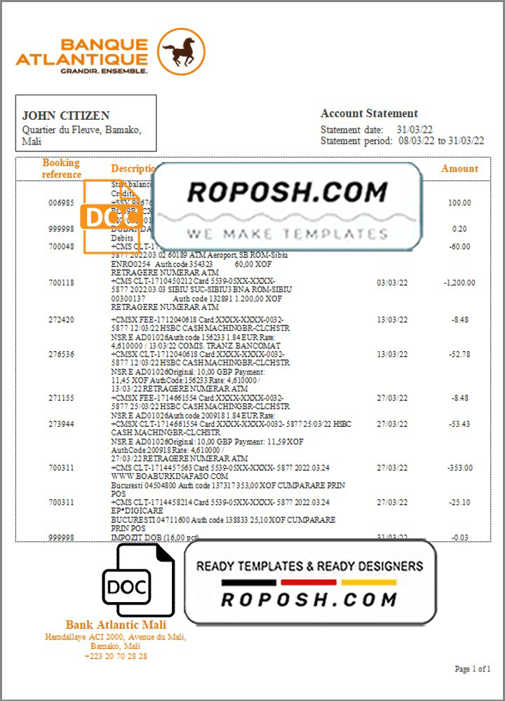 Get your fully editable Mali Banque Atlantique bank statement Word Template from Roposh now. Customize it with your information to create a realistic bank statement for novelty purposes. This is especially useful if your bank statement is expired, stolen, or unavailable. We also offer editable credit card templates, ID card templates, bank statement PSD templates, driver’s license PSD templates, and printable editable blank utility bill templates.