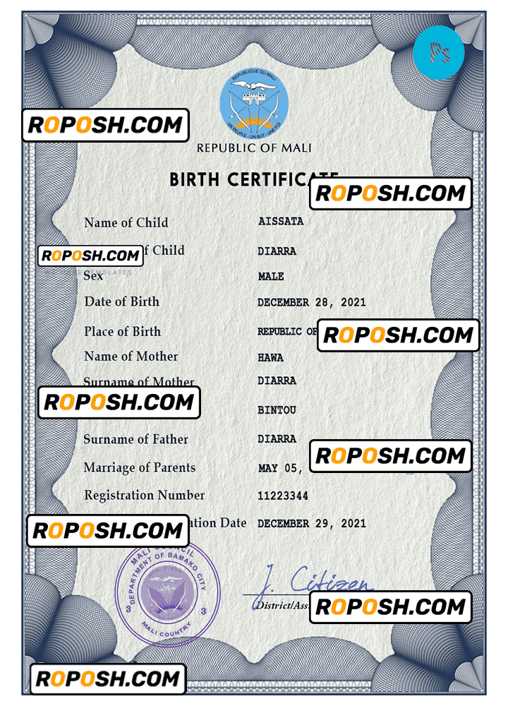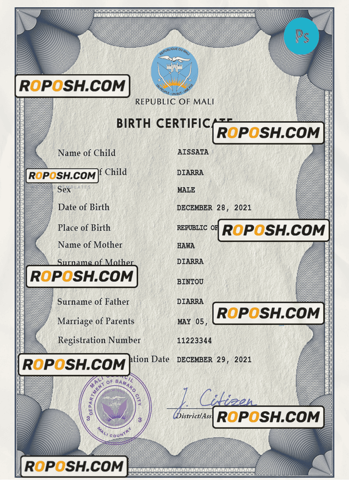 roposh offers hundreds of high-quality, realistic, and customizable birth certificates. The Mali birth certificate template is fully fillable, and you can complete it with any information you wish, such as name, surname, birth date, place of birth and etc. Whether you are using our PSD template (a layer-based adobe photoshop file) or our PDF template (a Microsoft Office editable file) you will get a package with fonts included instantly. No need to worry even if you can’t generate realistic birth proof yourself, we offer reliable editing service with your desired information for an extra charge. Also, we are always online and here to help you experience a confident purchase. So, reach out!