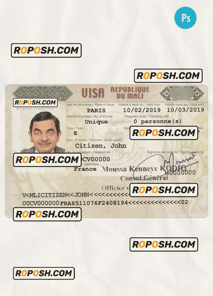 MALI entry visa template psd. Buy Customizable Travel Visa Template with high quality and enjoy its unique features such as easy to customize, Layer based, fonts included sample. you can edit this template and  put any name, address, license number, Id number, birth date, height, weight, expire date, change photos etc. This Photoshop template is a layer based psd file and it’s easy to Editing.To modify this photoshop template file you will need a Photo editing software such as Adobe Photoshop No need to be expert on editing software like adobe Photoshop. However, You just have to basic knowledge on adobe photoshop, to edit this template. Never used low quality template. Your account may be suspended. Also, if you’re looking for an editable SSN template, Roposh is by your side so you can get it easily and even for free.