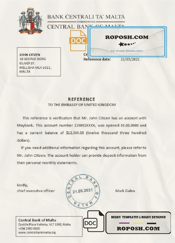 Malta Central Bank of Malta bank reference letter template in Word and PDF format