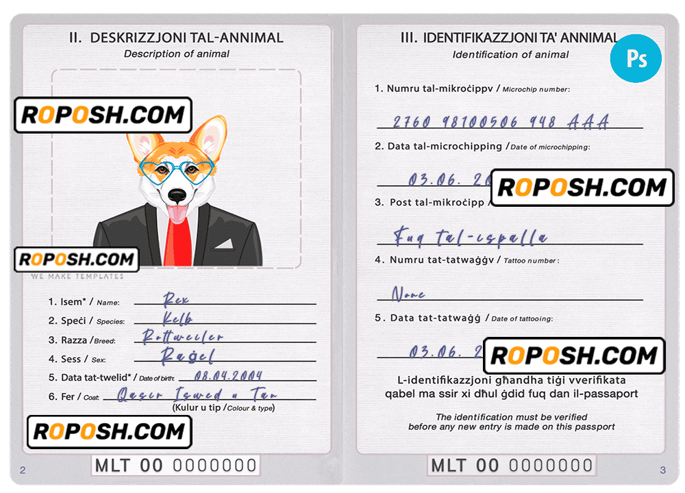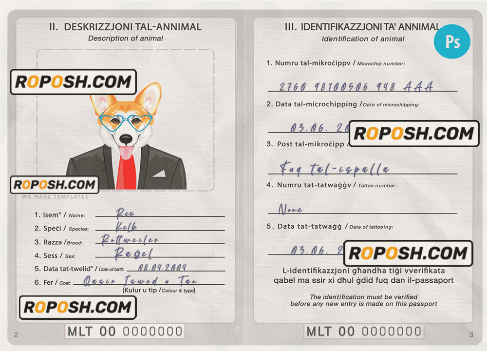 Malta dog (animal, pet) passport PSD template, is your one-stop-shop for realistic and editable editable pet identity cards and passports. We specialize in creating high-quality, customizable editable pet passports and identity cards for dogs, cats, and other furry friends.