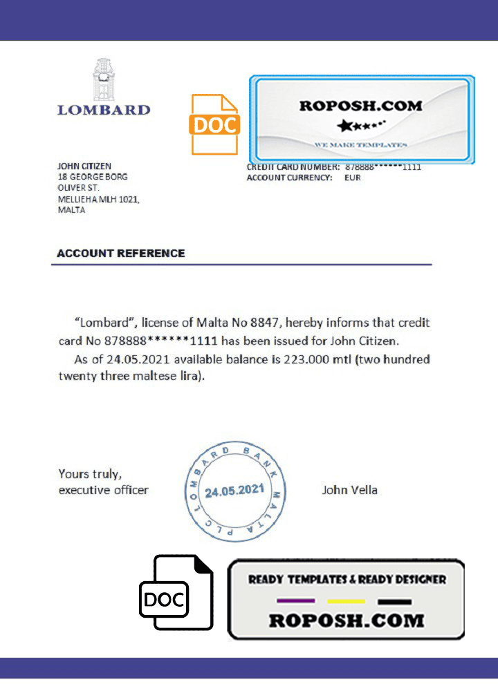Malta Lombard bank reference letter template in Word and PDF format
