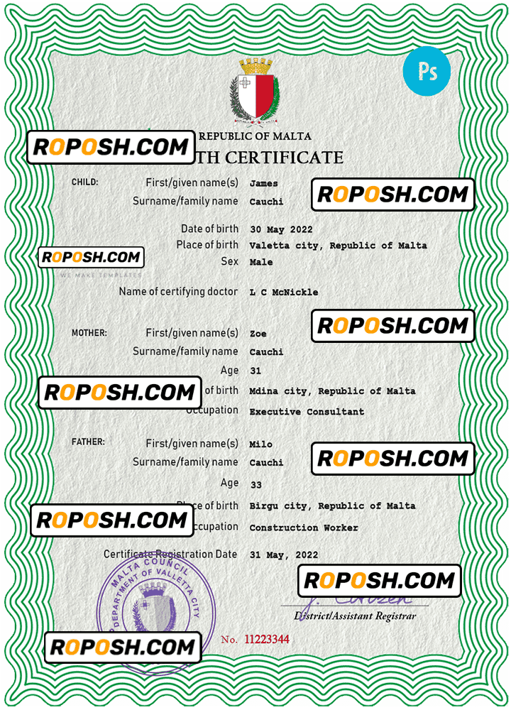 roposh offers hundreds of high-quality, realistic, and customizable birth certificates. The Malta birth certificate template is fully fillable, and you can complete it with any information you wish, such as name, surname, birth date, place of birth and etc. Whether you are using our PSD template (a layer-based adobe photoshop file) or our PDF template (a Microsoft Office editable file) you will get a package with fonts included instantly. No need to worry even if you can’t generate realistic birth proof yourself, we offer reliable editing service with your desired information for an extra charge. Also, we are always online and here to help you experience a confident purchase. So, reach out!