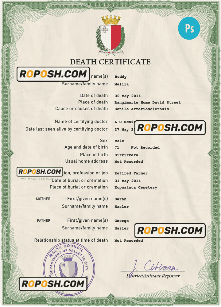 Malta vital record death certificate PSD template