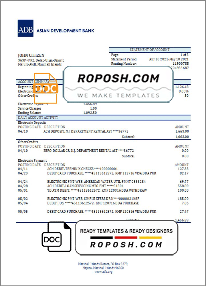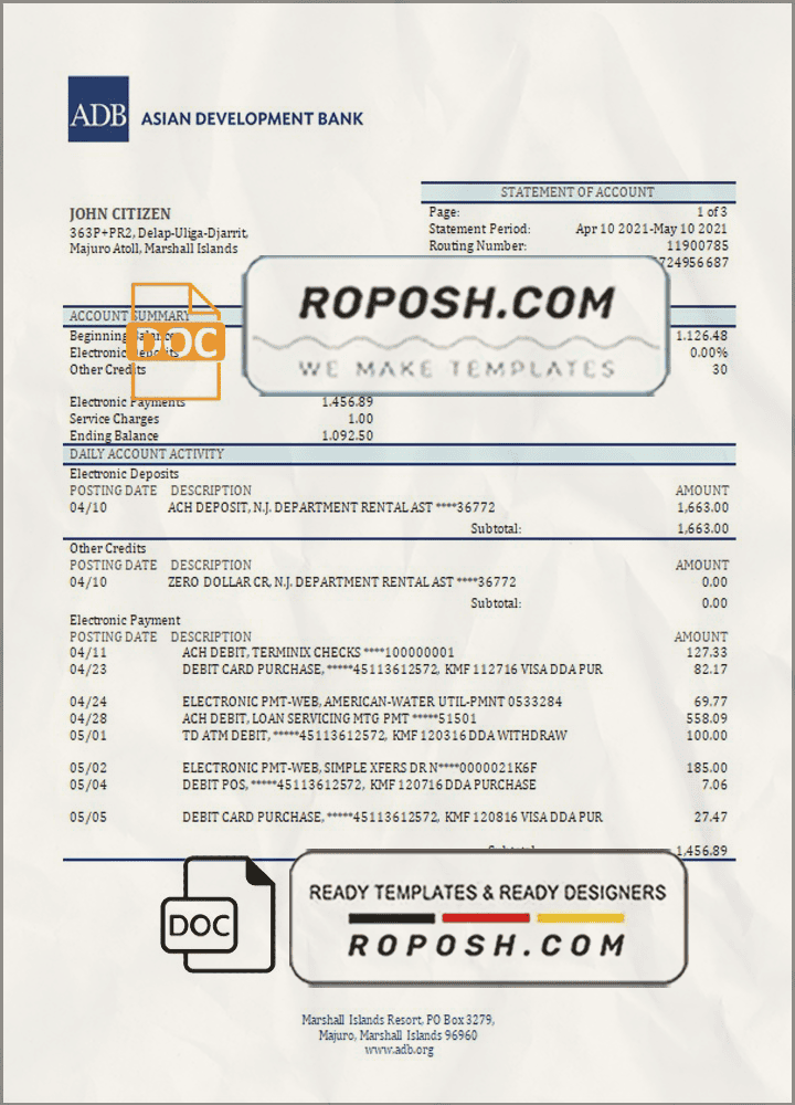 Get your fully editable Marshall Islands ADB bank statement Word Template from Roposh today. Customize it with your information to create a realistic bank statement for educational or theatrical purposes. We also offer editable credit card templates, ID card PSD templates, bank statement PSD templates, driver’s license PSD templates, and printable editable blank utility bill templates.
