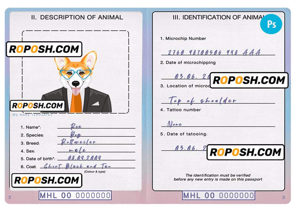 Marshall Islands dog (animal, pet) passport PSD template, is your one-stop-shop for realistic and editable editable pet identity cards and passports. We specialize in creating high-quality, customizable editable pet passports and identity cards for dogs, cats, and other furry friends.