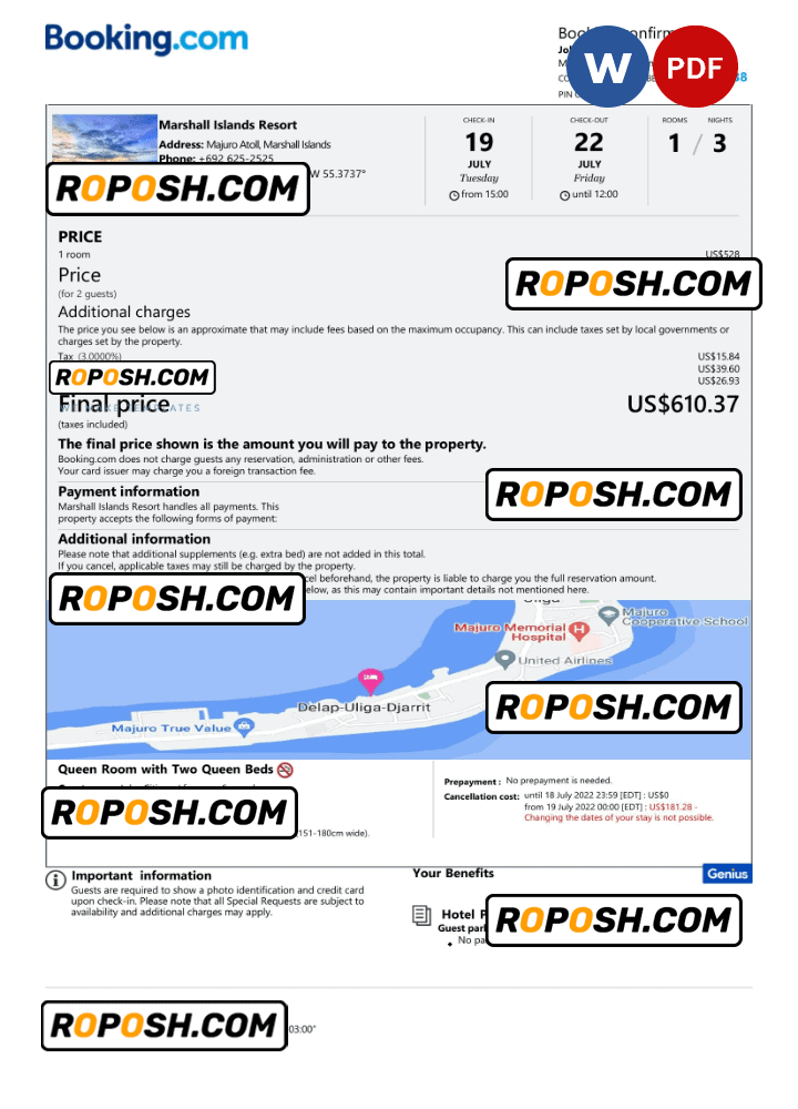 With its user-friendly design and flexible editing capabilities, this editable Marshall Islands hotel booking confirmation hotel, room, house, and Airbnb reservation proof is the perfect choice for anyone looking to create a professional-quality editable hotel accommodation reception. So why wait?