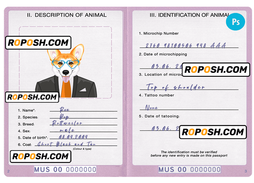 Mauritius dog (animal, pet) passport PSD template, is designed to look and feel like real documents. Each template is carefully crafted to include all the necessary details, such as your pet’s name, breed, date of birth, and microchip information. With our fillable cat or dog passport templates, you can quickly and easily create a editable pet passport that meets all the requirements for international travel.
