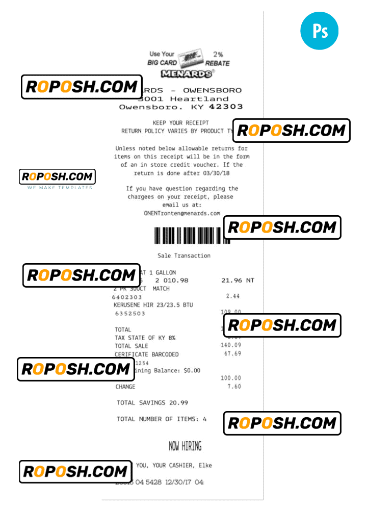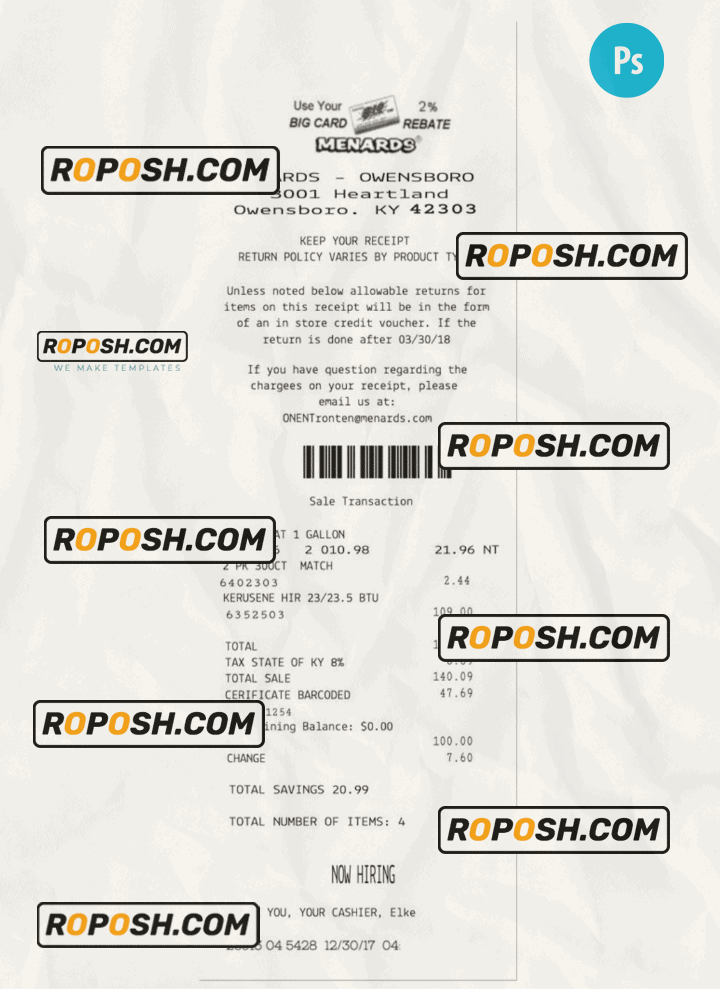 Features Editable MENARDS Receipt PSD Template :