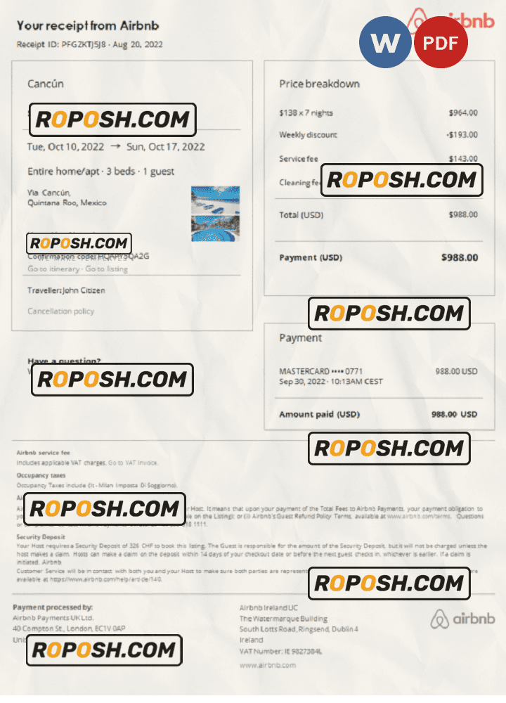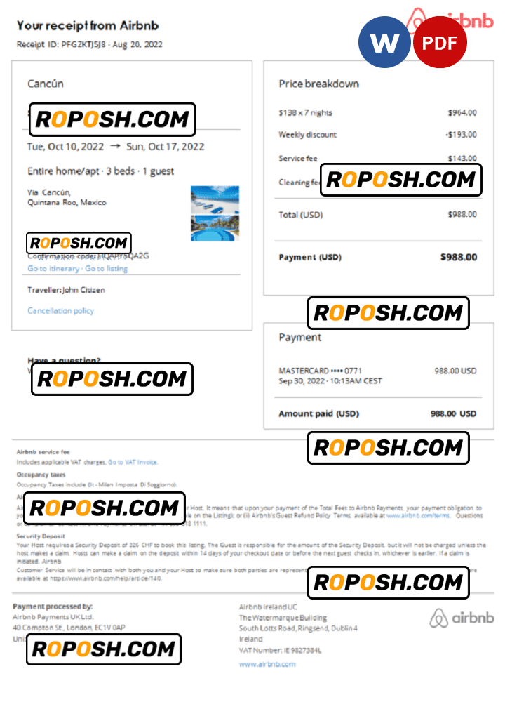 This Blank Mexico Airbnb booking confirmation PDF Template is perfect for a variety of uses, such as Visa applications, proof of accommodation, showing your expenses, and more. You can even use it to create realistic copies of your credit card for novelty documents. We have a variety of other templates available, including passport templates, ID card templates, reciept template, and more.