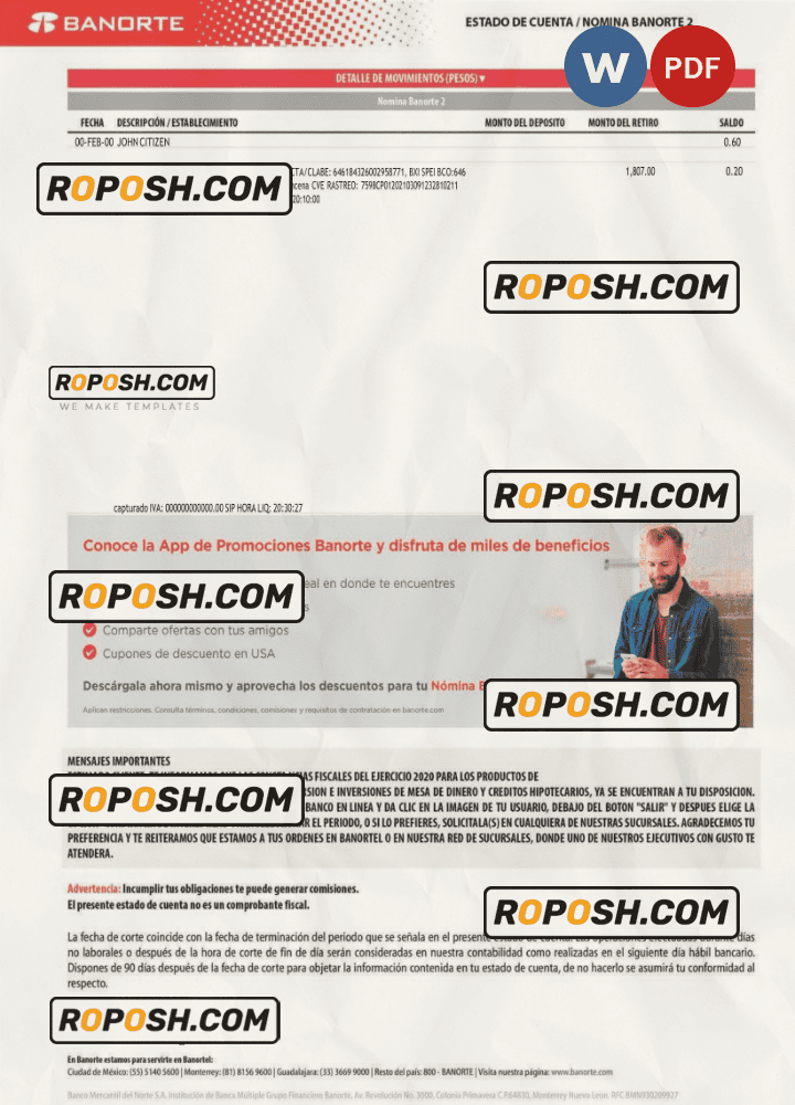 blank Mexico Banorte bank statement Word template . Fully editable Word template. High quality template. Easy to customize, Layer based, fonts included. you can edit this template and put any name, address, license number, Id number, birth date, height, weight, expire date, change photos etc. This Word template is a easy to Editing.To modify this Word template file you will need a Word editing software such as Microsoft Word.Our downloadable bank statement templates enable you to submit the required information. So, you can easily fill out your banking statement assets.You do Not need Photoshop for editing this template. Never used low quality template. Your account may be suspended.