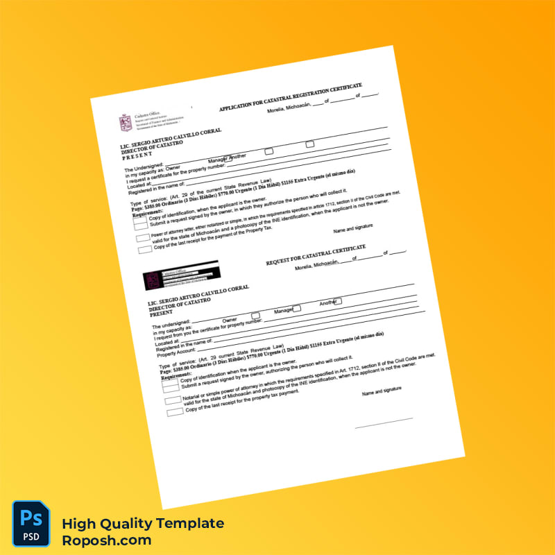 Mexico Cadastral Office Request for Cadastral Registration Certificate Template in Word and PDF formats