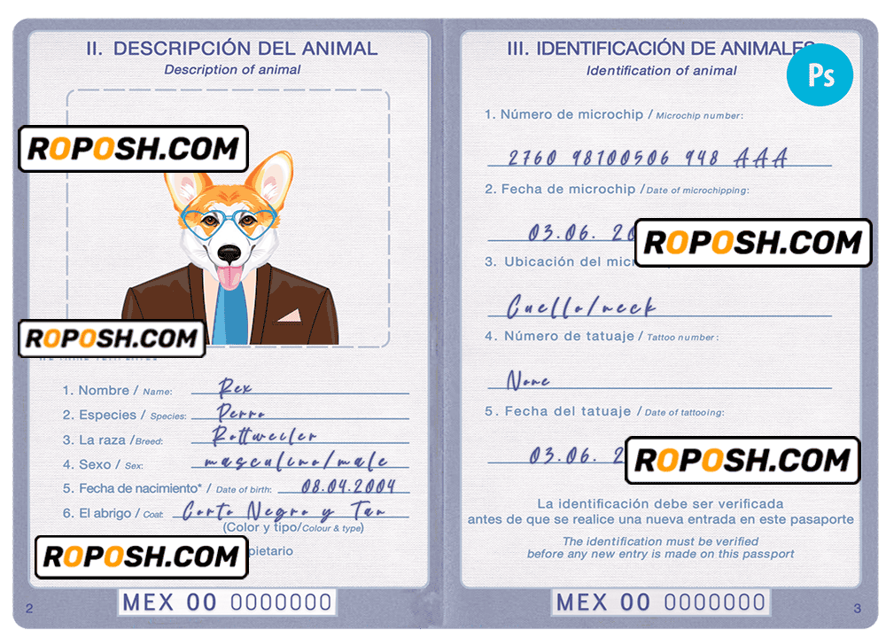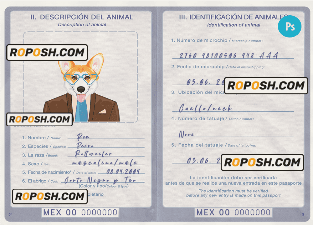 Mexico dog (animal, pet) passport PSD template, is designed to look and feel like real documents. Each template is carefully crafted to include all the necessary details, such as your pet’s name, breed, date of birth, and microchip information. With our fillable cat or dog passport templates, you can quickly and easily create a editable pet passport that meets all the requirements for international travel.