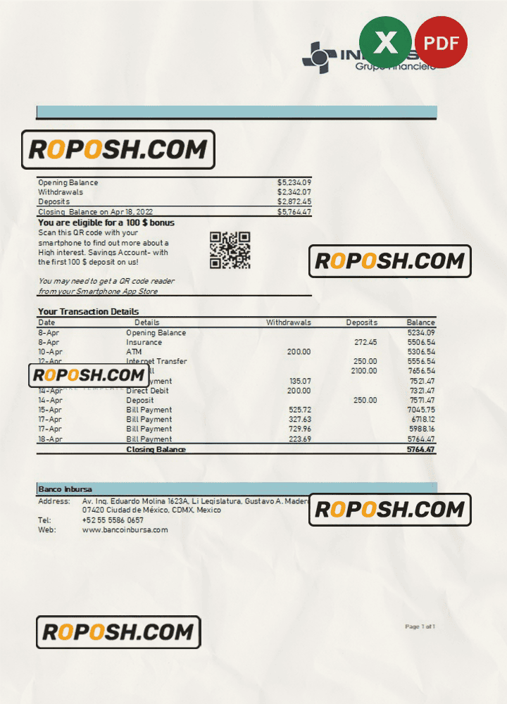 Grab now fully editable Mexico Inbursa bank statement Excel Template from our website Roposh and put your own info to create Realistic Bank Statement template Excel and ready your own novelty documents. It’ll be so beneficial if your Bank Statement is expired, stolen or not available.We also have editable credit card, ID Card psd template, Bank Statement psd template, drivers license psd template & printable editable blank utility bill template.