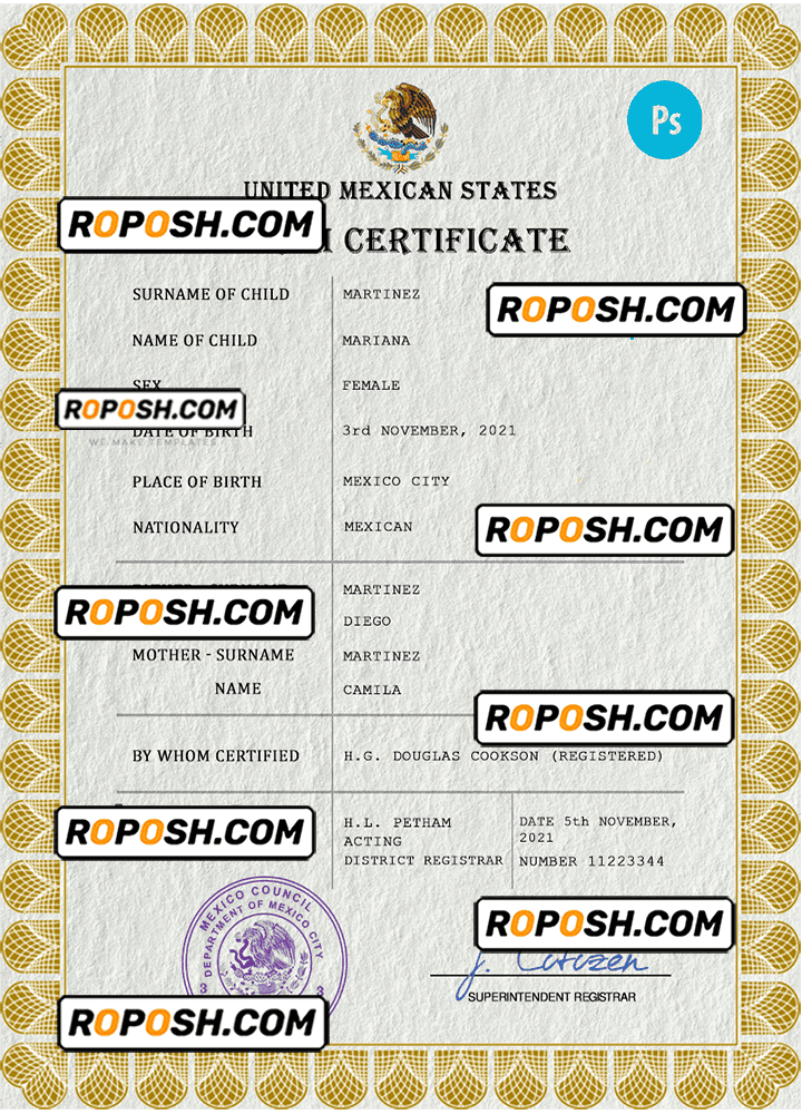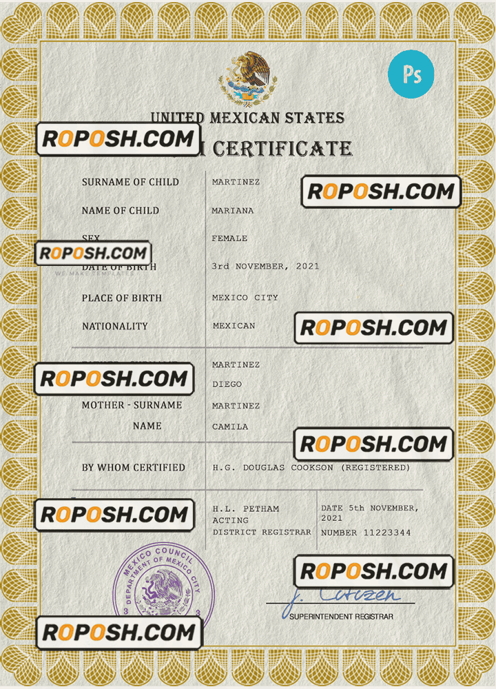 roposh offers hundreds of high-quality, realistic, and customizable birth certificates. The Mexico birth certificate template is fully fillable, and you can complete it with any information you wish, such as name, surname, birth date, place of birth and etc. Whether you are using our PSD template (a layer-based adobe photoshop file) or our PDF template (a Microsoft Office editable file) you will get a package with fonts included instantly. No need to worry even if you can’t generate realistic birth proof yourself, we offer reliable editing service with your desired information for an extra charge. Also, we are always online and here to help you experience a confident purchase. So, reach out!