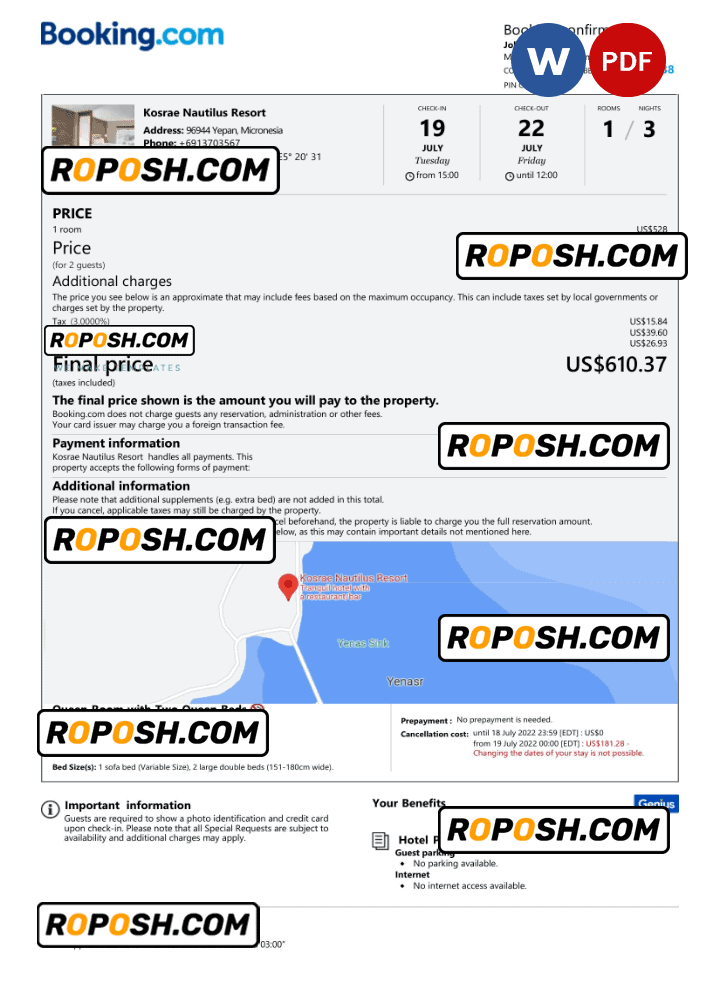With its user-friendly design and flexible editing capabilities, this editable Micronesia hotel booking confirmation hotel, room, house, and Airbnb reservation proof is the perfect choice for anyone looking to create a professional-quality editable hotel accommodation reception. So why wait?