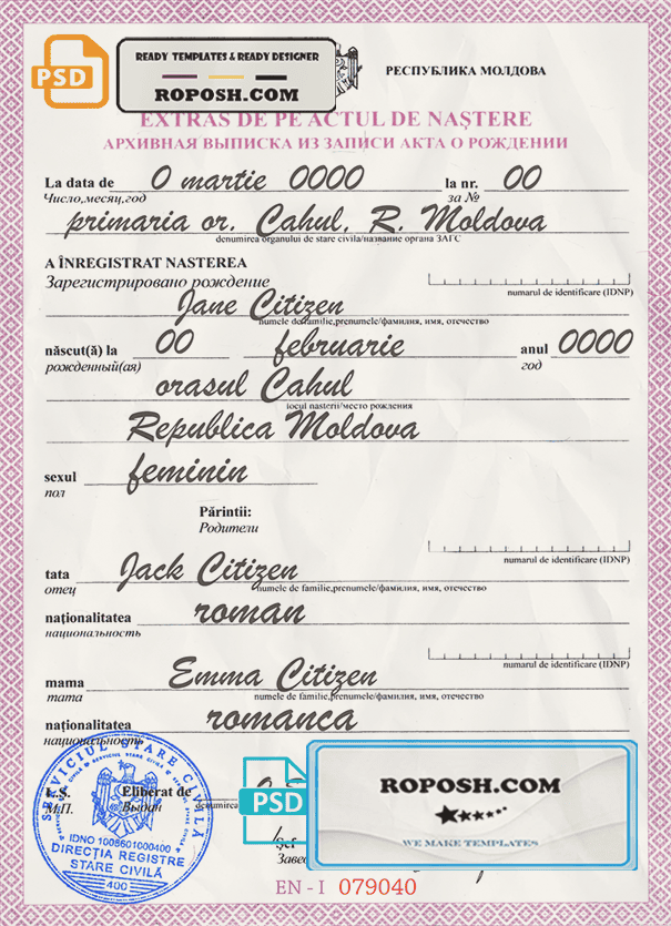 roposh offers hundreds of high-quality, realistic, and customizable birth certificates. The Moldova birth certificate template is fully fillable, and you can complete it with any information you wish, such as name, surname, birth date, place of birth and etc. Whether you are using our PSD template (a layer-based adobe photoshop file) or our PDF template (a Microsoft Office editable file) you will get a package with fonts included instantly. No need to worry even if you can’t generate realistic birth proof yourself, we offer reliable editing service with your desired information for an extra charge. Also, we are always online and here to help you experience a confident purchase. So, reach out!