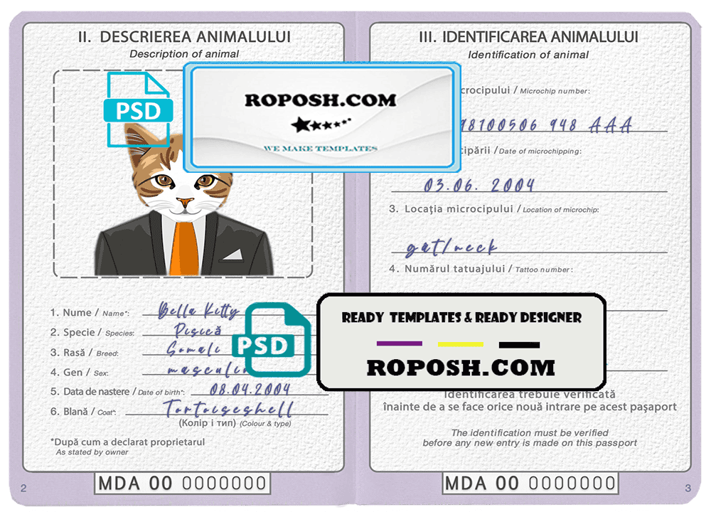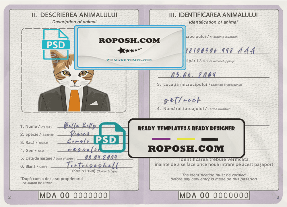 Moldova cat (animal, pet) passport PSD template, is designed to look and feel like real documents. Each template is carefully crafted to include all the necessary details, such as your pet’s name, breed, date of birth, and microchip information. With our fillable cat or dog passport templates, you can quickly and easily create a editable pet passport that meets all the requirements for international travel.