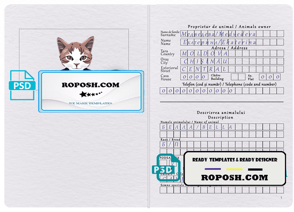 Moldova cat (animal, pet) passport PSD template, is designed to look and feel like real documents. Each template is carefully crafted to include all the necessary details, such as your pet’s name, breed, date of birth, and microchip information. With our fillable cat or dog passport templates, you can quickly and easily create a editable pet passport that meets all the requirements for international travel.