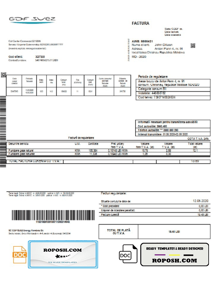 Download our high-quality, fully editable Moldova Gas Utility Bill Word template. This customizable template is layer-based and includes all necessary fonts. Easily modify the template to include any name, address, license number, ID number, birth date, height, weight, expiration date, and more. Perfect for creating a editable utility bill for proof of address. Ensure your documents are up-to-date and avoid account suspensions with our premium template.