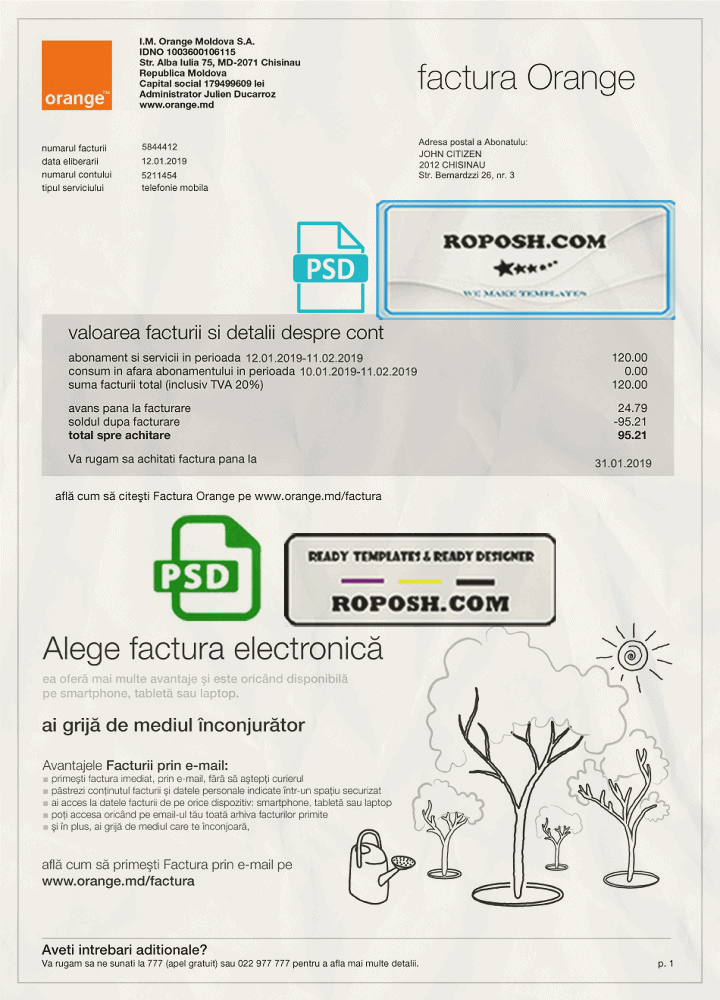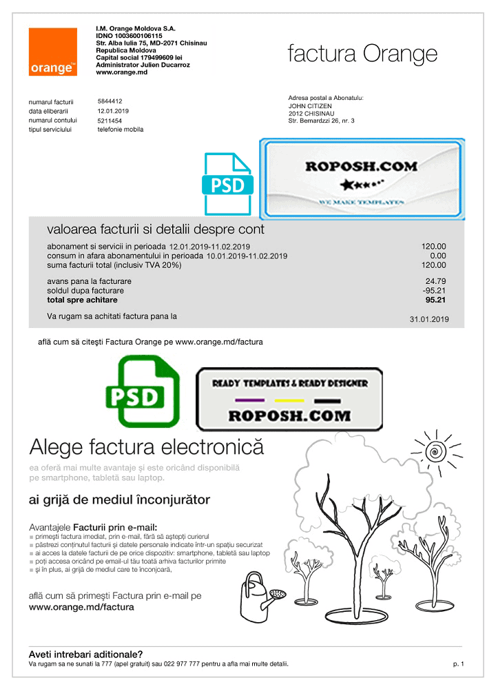 Get your hands on a blank Moldova Orange Utility Bill Template from Roposh. Customize it with your own information to create a copy for proof of address. Ideal for situations where your utility bill is expired, stolen, or unavailable. We also offer a variety of other templates, including passport PSD templates, ID card PSD templates, bank statement PSD templates, driver’s license PSD templates, and utility bill PSD templates.
