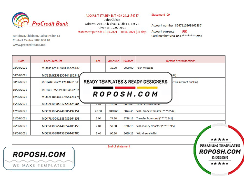 Get your fully editable Moldova Procredit Bank Statement Template from Roposh and customize it with your information to create a realistic bank statement. This is beneficial if your bank statement is expired, stolen, or unavailable. We also offer editable credit card templates, ID card templates, bank statement PSD templates, driver’s license PSD templates, and printable editable blank utility bill templates.