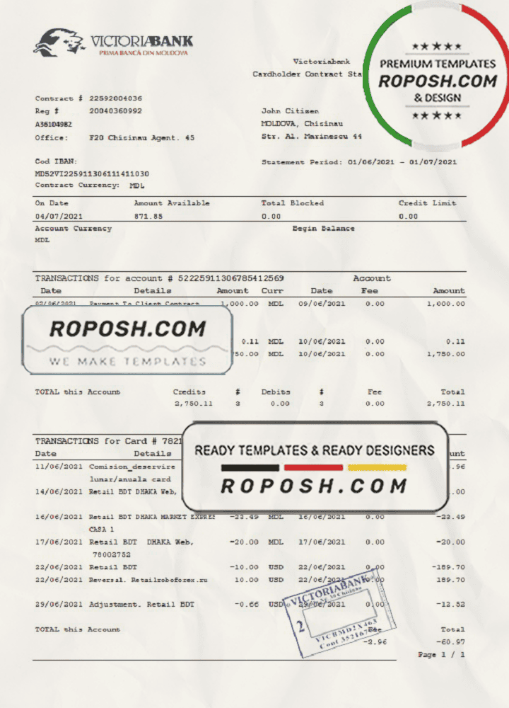 Grab now fully editable Moldova Victoriabank bank statement easy to fill Excel Template from our website Roposh and put your own info to create Realistic Bank Statement template Excel and ready your own novelty documents. It’ll be so beneficial if your Bank Statement is expired, stolen or not available.We also have editable credit card, ID Card psd template, Bank Statement psd template, drivers license psd template & printable editable blank utility bill template.